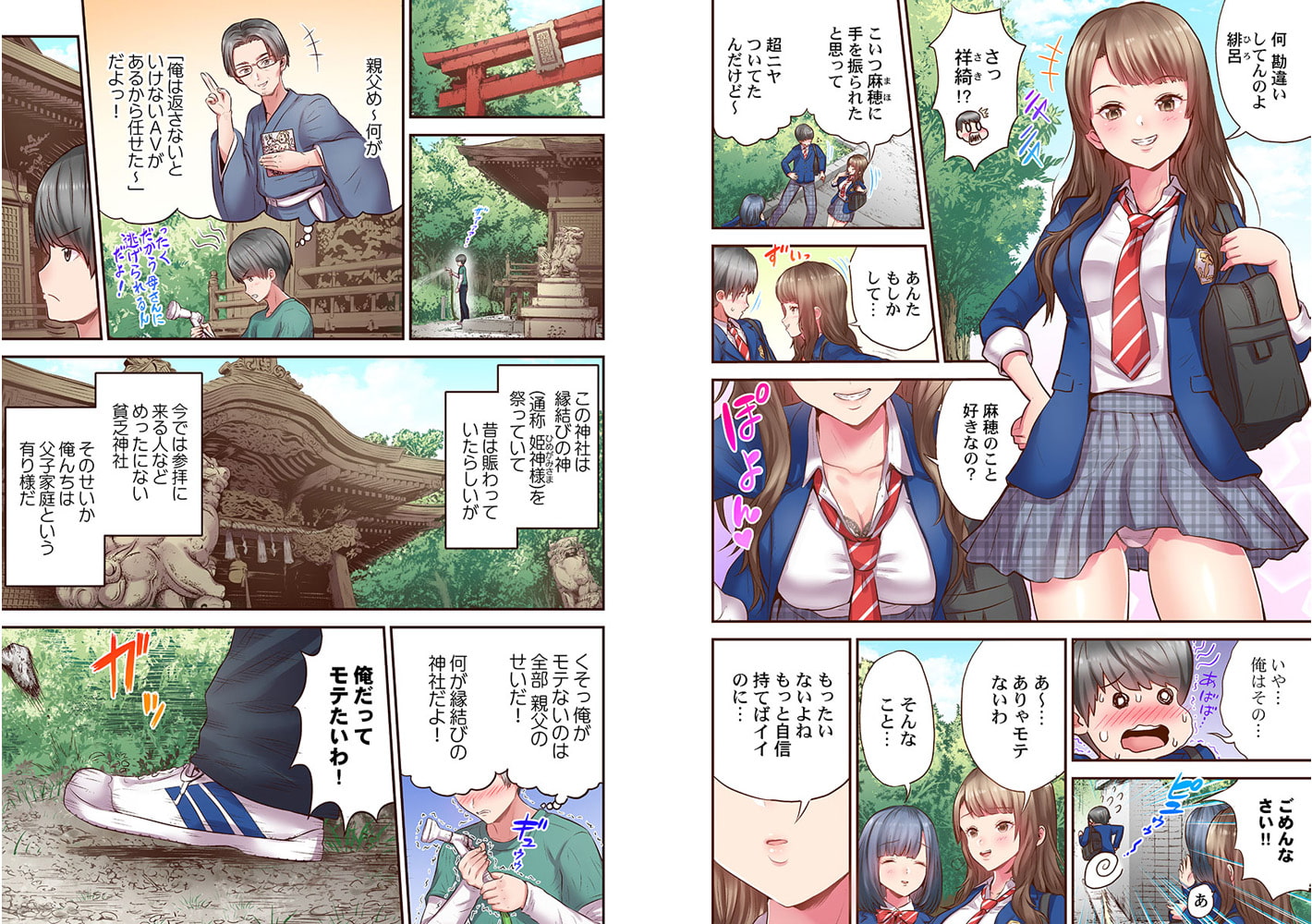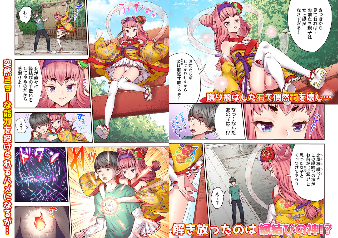 「ダメッ…おかしくなるから…もう離してぇ…ッ!」顔とアソコが密着して擦れ合い…イクまで、この快楽からは逃げられない!?--『縁結びの神』を奉る貧乏神社の息子なのに、女子との縁が全くない緋呂。それを嘆いた神が緋呂に授けたのは、緋呂が可愛いと感じた女の子と赤い縄で縛られ、ところかまわず強○密着してしまう『物理的縁結び』の能力だった。いつも緋呂をからかうクラスメイトの祥綺相手に、その能力が発動してしまう。この縄を解く方法はただひとつ…密着した祥綺を、グショグショにとろけるほどイカせまくることで…