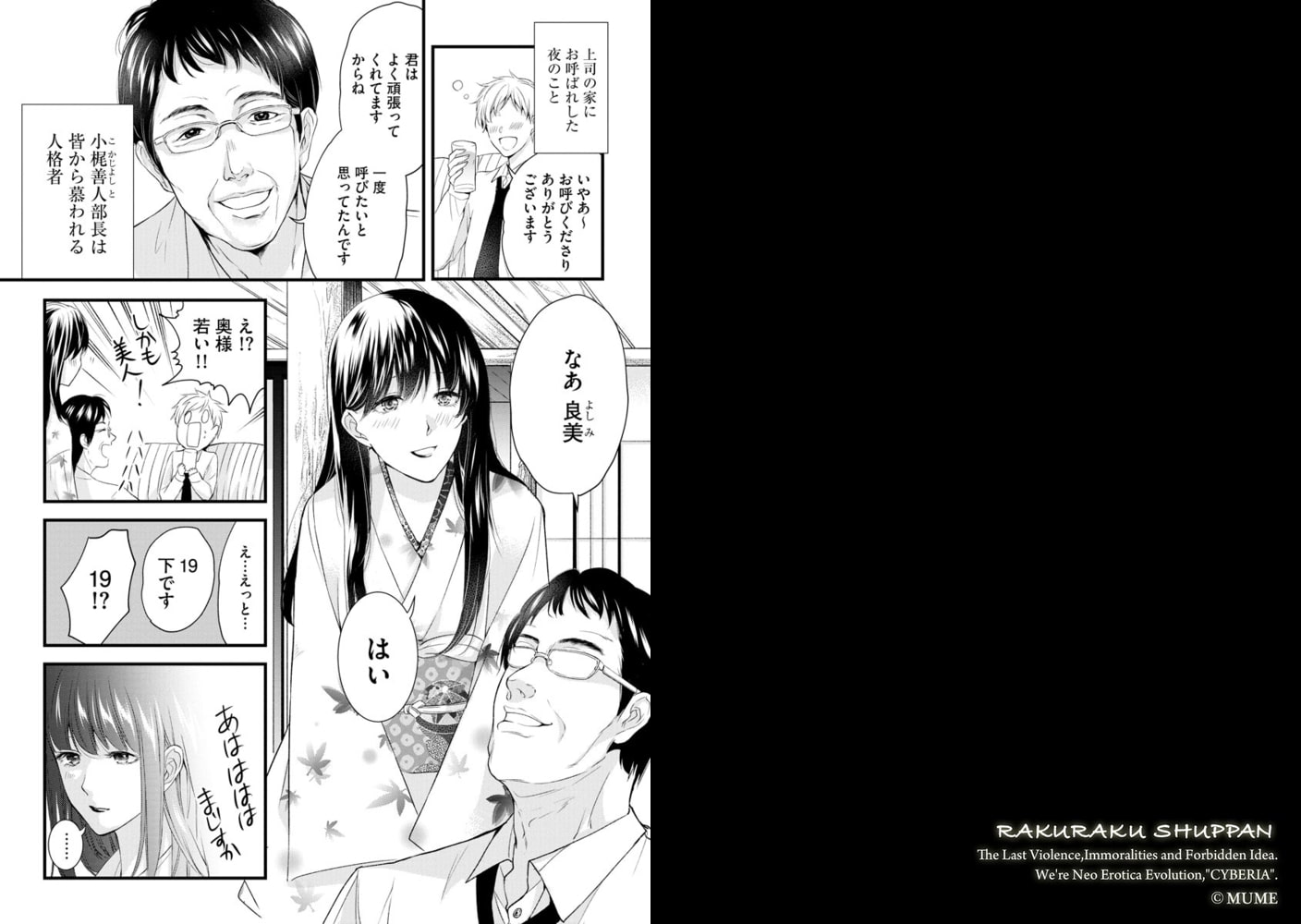 人柄の出来た理想の上司の家にお呼ばれした俺は、彼の人格に相応しい立派な家と19歳離れている若奥様に面食らっていた。しこたまごちそうになり、千鳥足で上司の家を出た俺はケータイを忘れていることに気づく。酔っぱらって判断力が弱くなっていた俺は、インターホンの鳴らない玄関を勝手に上がり、闇の中で一室だけ明かりの漏れる居間を見つけ、襖の隙間から中を覗く。すると若奥様が上司にぐちゃぐちゃに攻められている光景が…!? 昼の顔と夜の顔のギャップが激しい夫婦の合意の上の変態プレイを覗き見ている感じがエロ。