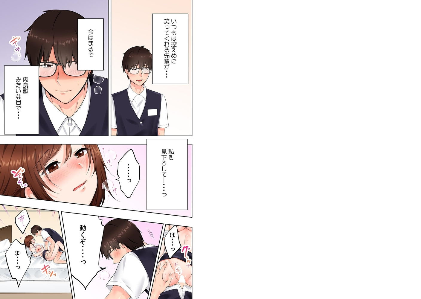 「だめっ、私…こんな無理矢理セックスで…イかされちゃうぅ…っ」――何かとお金のかかる大学生活、時給の良いラブホバイトを始めた春佳。そこで働く優しい先輩と付き合えて全てが順調!のはずだったんだけど…キス以上のことはシてくれない先輩。何で?私に魅力がないから?これじゃ私だけが早くエッチしたいみたい…と悶々としていたそんなある日。バイト先に元彼が入社してきて…?元彼と二人きりで仕事中「あの先輩ってなんか暗そうだしさぁ…ちゃんと満足できてんの?」と突然ベッドに押し倒され、欲求不満で敏感になっているア〇コを指でクリクリ!? 逃げなきゃなのに…気持ち良すぎて動けない…っ
