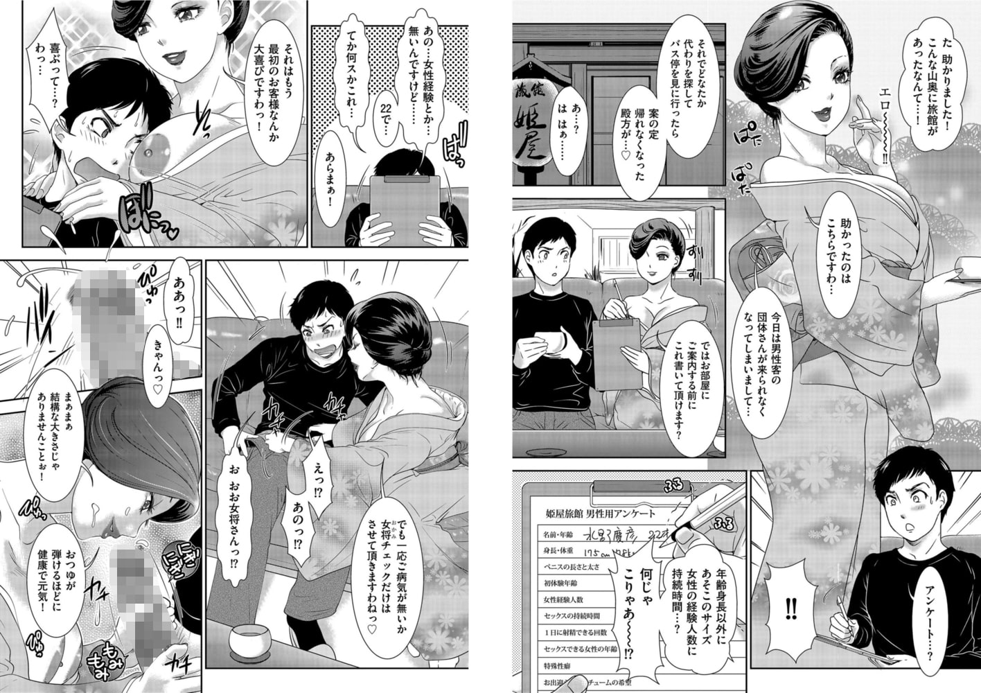 山中にて旅の青年を強引に宿に誘い、肉棒チェックまで始める女将。まずはと通された部屋にはなぜか半裸の先客美熟女がくつろぎ…って、これどういうこと!? 純朴な童貞青年の異界痴獄巡りがいま始まる!!