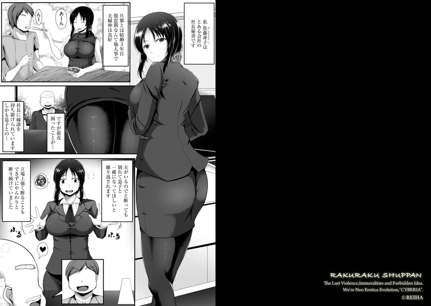とある会社の社長秘書を務める人妻・佐藤冴子の雇い主のタヌキ社長は彼女に夫がいるにも関わらず息子との縁談を冴子に勧めてくる。