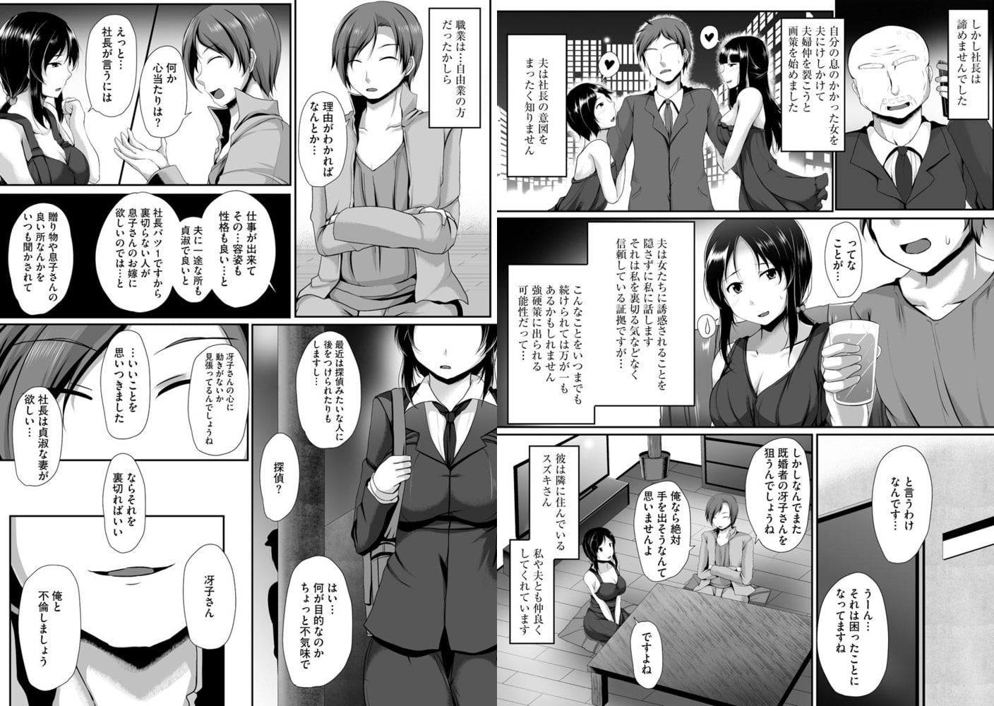 しかしあるとき堪りかねて隣人の男性に自分の境遇を相談すると、同情し協力するという彼は「探偵に貞操観を見張られているのであれば逆に不貞を働いていることを観察させ社長を失望させればいい」と持ち掛けられる。