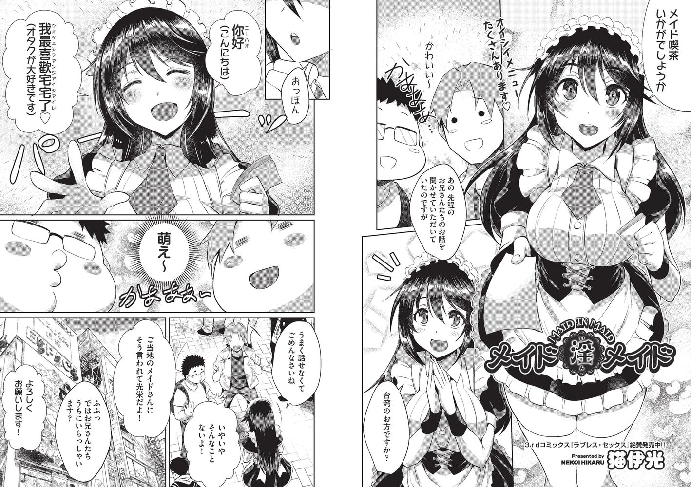 メイド喫茶の聖地にくるため来日したマークとトシの台湾人二人を勧誘するメイドの優香。なれない中国語を使う優香に萌えてしまった二人は優香の働くメイド喫茶に案内されると優香が隣に座ってきてメイド喫茶の御奉仕より過激なサービスが始まってしまう!?店のうらに出てエッチなサービスの続きを始める優香と台湾人二人の3人はどんどんエスカレートして屋外で生挿入3Pセックス開始!!