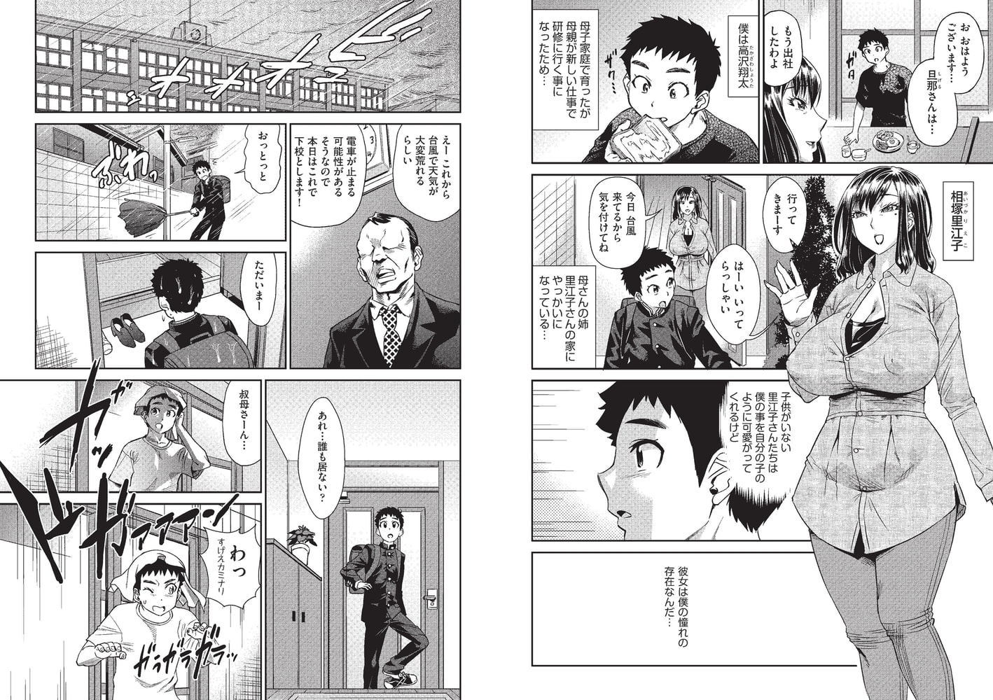 わけあって叔母の家にやっきになっている翔太くん。ある日台風で停電して伯父がも帰宅できなくなって二人きりに。叔母はカミナリが苦手で一緒に寝て欲しいと言って来て一つのベッドで寝ることに。はち切れんばかりのボディをもつ叔母が横で寝ていて勃起がおさまらない翔太は寝ている叔母のパンティをずらしアソコを舐め始めると叔父と勘違いした叔母自らパンティを脱ぎ捨て「好きにしていいわよ」と言ってきたので遠慮なく生挿入!!途中で間違いと気がついた叔母も旦那が最近構ってくれないこともあって引き返さずに快楽を貪る!!