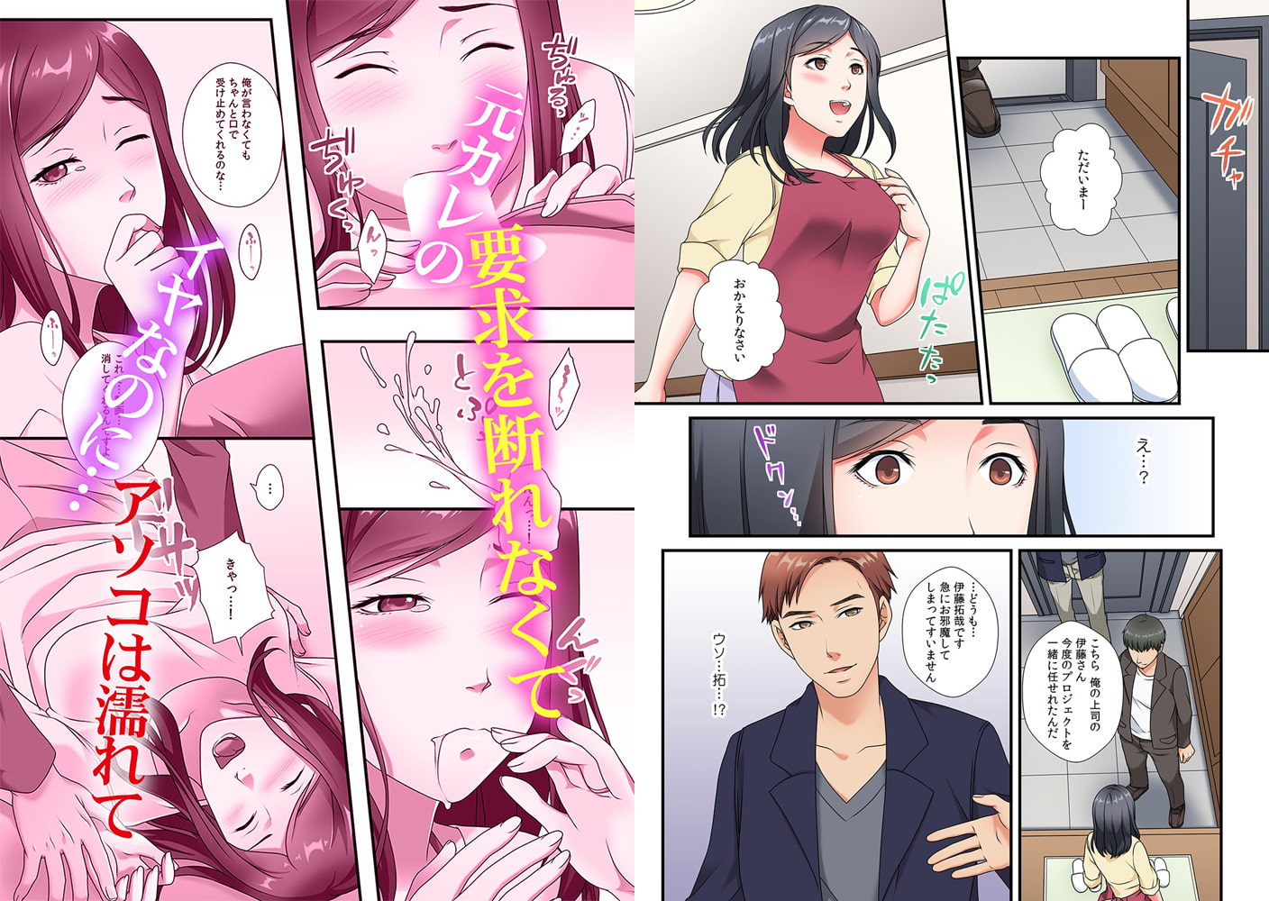 「お前の感じる場所は、旦那よりよく知ってんだよ!」――優しくて真面目な夫との幸せな新婚生活。夫は記念日だって忘れた事がないし、私の事をとても大切にしてくれる。だけど少しだけ物足りなくて、夫がいない間に自らを慰める日々…。そんな時、夫が会社帰りに連れてきた上司は元カレでヤリチンの拓哉だった!?私の事に気付いた拓哉は夫が酔い潰れた途端に本性を現し、昔のハメ撮り動画を見せ脅してくる。「気持ちよくしてくれよ…その口で」逆らえない私におち〇ちんを咥えさせ、その上アソコに指を挿し込みグチュグチュとイジりまわしてくる「ダメ…夫よりもすごい…」トロトロになったアソコには拓哉の固くなったモノがあてがわれて…。