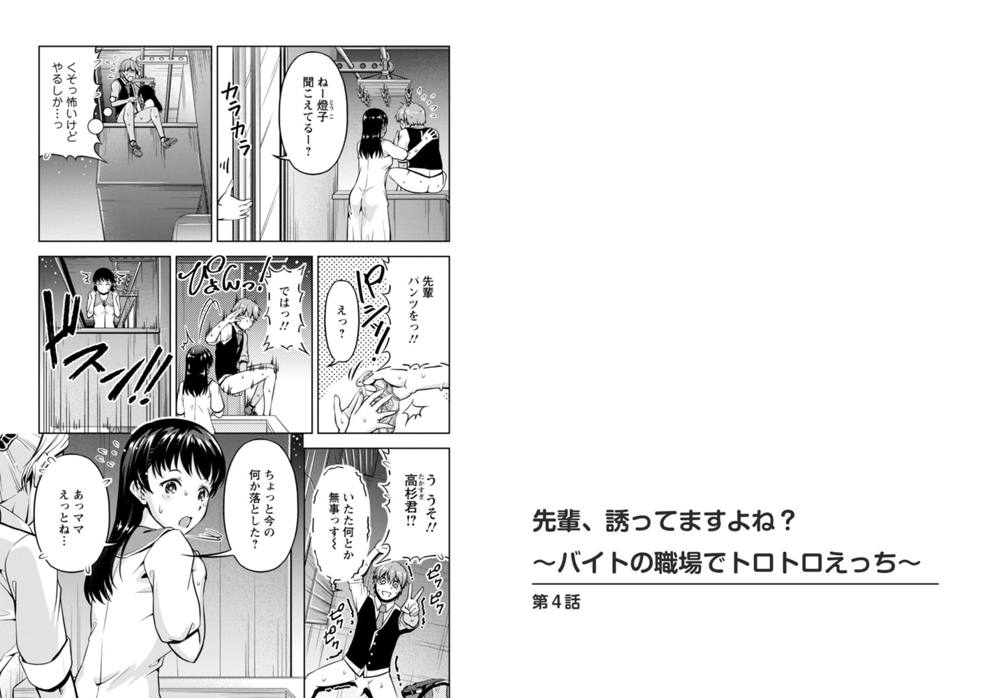 「イっちゃうぅ…声出ちゃうのぉぉっ」憧れの先輩の喫茶店でバイトしている高杉宋馬。マスターは強面だけど大好きな先輩と一緒に働けて楽しい日々。優しくて可愛い先輩はしっかりしているように見えて実は…。先輩のうっかりと宋馬の暴走が重なってバイト中にエッチなことが始まっちゃう!?先輩を押し倒してしまった宋馬は、先輩が自分を誘っていると勘違いして愛撫をはじめて喘がせにかかり…!カウンター越しにマスターがいることに気づかないままエッチの手は止まらない!!必死に声を我慢する先輩を同意と受け取り、そのまま挿入までしちゃって…!?