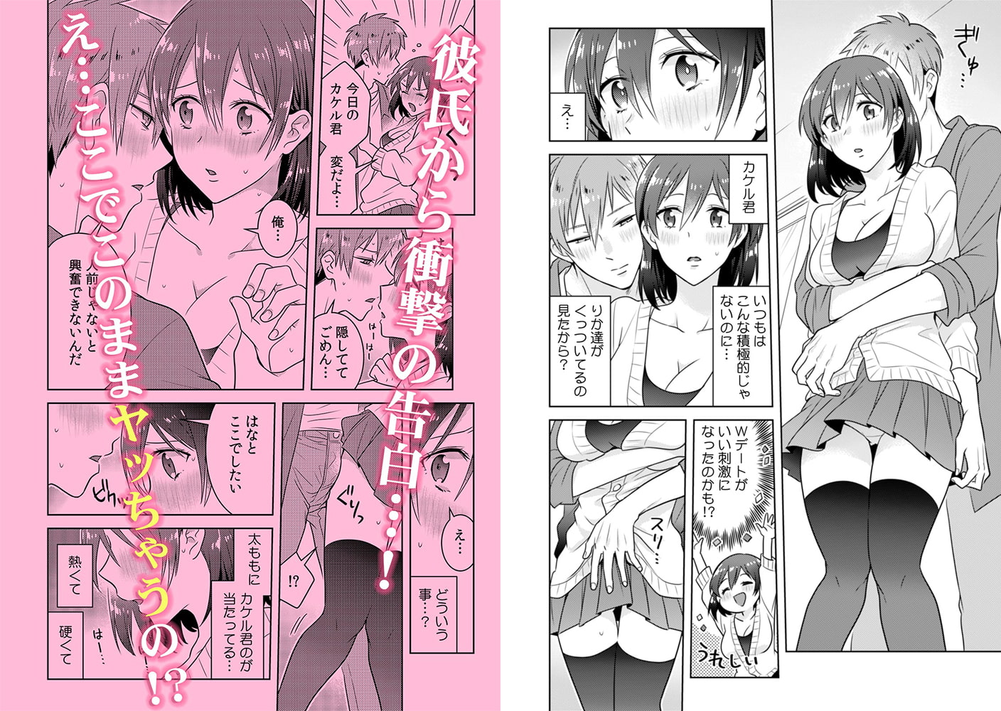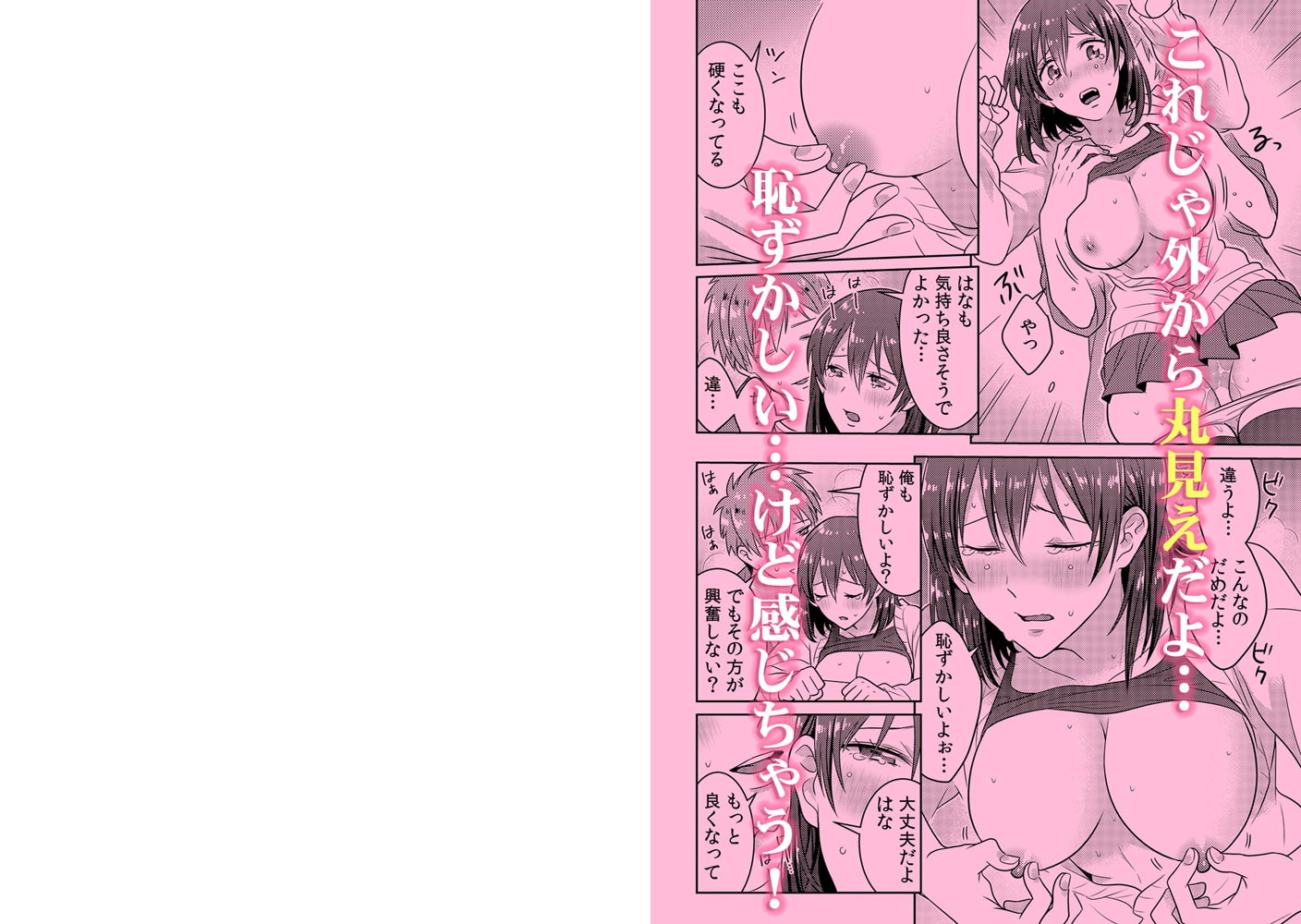 「ここ外なのに…そんなとこまで弄られたらもう…イッちゃう!」――私とカケル君は付き合って半年でエッチは未経験…。奥手な彼のことを友人に愚痴ったら、見本を見せてあげると自宅でWデートをすることに。堂々とイチャつく友人カップルを前に、ついHな妄想をしてしまった私は火照りを冷ますためカケル君と一緒にベランダに避難。すると、いつもとは別人のように積極的に私に触れてくるカケル君…。もしかして友人カップルに感化されて…と思っていたら耳元で「俺、人前じゃないと興奮できないんだ」と衝撃の告白!「え?どういうこと…」と受け入れられない私のアソコを彼の手はくちゅくちゅと弄り始め、通行人から丸見えの乳首もコリコリと指で転がされ…。いつバレてもおかしくない状況で、ついには固くなったカケル君のおち〇ちんをズプリと挿入され…!「恥ずかしくて嫌だけど…カケル君の大きいので突かれたらもう…我慢できないっ!」