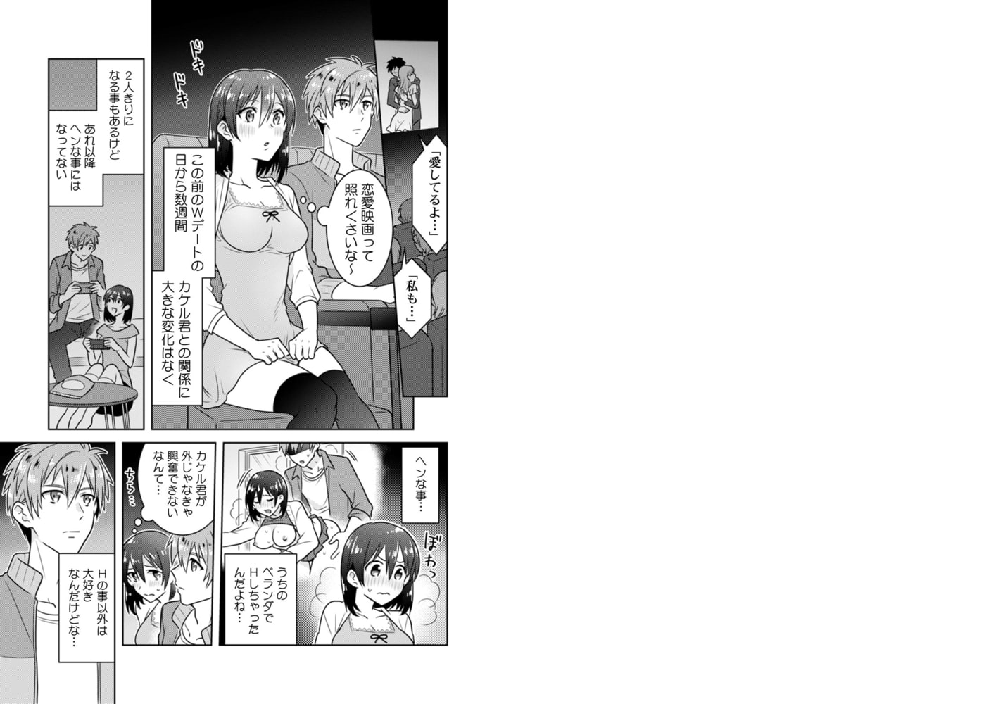 「ここ外なのに…そんなとこまで弄られたらもう…イッちゃう!」――私とカケル君は付き合って半年でエッチは未経験…。奥手な彼のことを友人に愚痴ったら、見本を見せてあげると自宅でWデートをすることに。堂々とイチャつく友人カップルを前に、ついHな妄想をしてしまった私は火照りを冷ますためカケル君と一緒にベランダに避難。すると、いつもとは別人のように積極的に私に触れてくるカケル君…。もしかして友人カップルに感化されて…と思っていたら耳元で「俺、人前じゃないと興奮できないんだ」と衝撃の告白!「え?どういうこと…」と受け入れられない私のアソコを彼の手はくちゅくちゅと弄り始め、通行人から丸見えの乳首もコリコリと指で転がされ…。いつバレてもおかしくない状況で、ついには固くなったカケル君のおち〇ちんをズプリと挿入され…!「恥ずかしくて嫌だけど…カケル君の大きいので突かれたらもう…我慢できないっ!」
