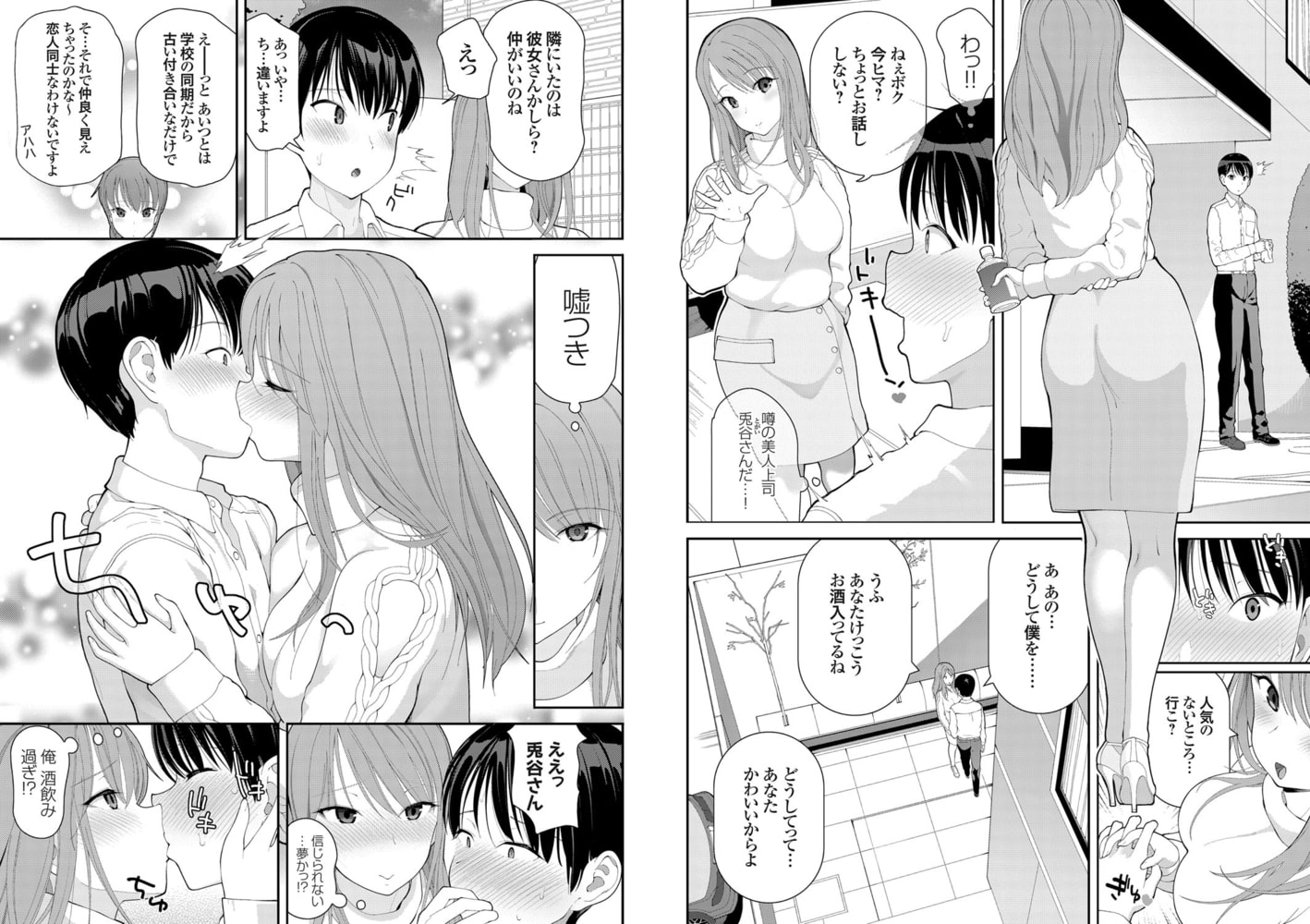 とある会社の歓迎会で新入社員の純(じゅん)となつみが談笑しているのを見つめる兎谷寧々(とがい ねね)。二人の様子を見て間違いなく付き合ってると確信した寧々は、自分の求める獲物としては好適とドリンクに怪しげな粉を混ぜ隙を窺う。席を外すや否や即座に追いかけトイレから出た純に親しげに話しかける寧々。美人上司と社内でも評判の寧々に話しかけられた純はすっかり舞い上がり、人気のない所に行こうと誘われ応じてしまう。なぜ自分が誘われたかわからず疑問を投げかけると寧々は可愛いからとシンプルに答え、隣にいたなつみは彼女なのかと問いかける。すると関係があるにもかかわらず、学校の同期で古い付き合いなだけだとはぐらかす純。即座に嘘に気付いた寧々はいきなり純の唇を奪い股間に手を伸ばして優しく擦り出す。突然の行為に戸惑いながらも寧々の甘い香りで理性を失った純は、なつみを待たせてるにもかかわらず流されるまま寧々に身を任せてしまうのであった…。