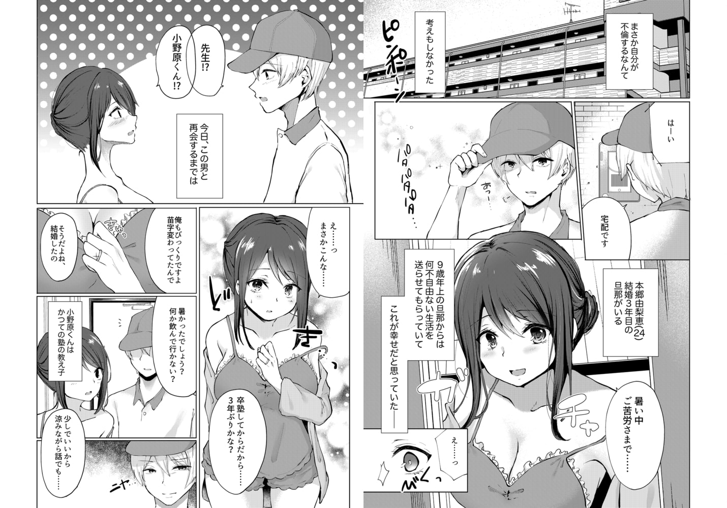 人妻・由梨恵は、結婚2年目の旦那とセックスレス。少し寂しいけれど何不自由ない生活を送っている。そんなある日、かつての教え子の男子学生と再会。宅配バイトでやってきた彼と話が盛り上がり、部屋にあげると…突然豹変!?「先生、無防備すぎ」そう言って押し倒されて下着の中に手を入れられて…。抵抗しなくちゃいけないのに、久しぶりに男性に触られてアソコはもうぐちょぐちょに溢れて止まらない。さらには反り立ったアレで奥を思いっきり突かれ…!味わった事のない快感に、自ら腰を振り続けてしまう。それ以来、彼と会うために再び宅配便を頼み、不倫セックスを重ねるが…?