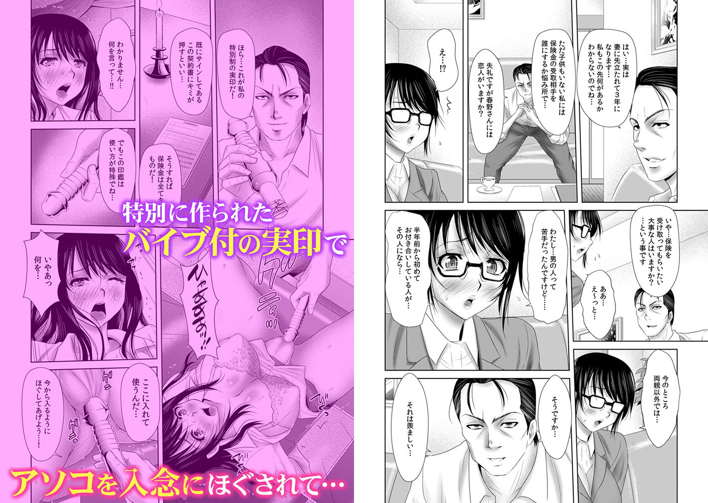 「そんな風にされたら私また変な感覚が…きちゃう!」――業務成績最下位の保険外交員「水希」は名誉挽回するべく、先輩に紹介された男性客の元を訪れていた。でもまさか接客中に薬を盛られるなんて…。気がつくと怪しい地下室で拘束され、椅子に縛られ、淫らな格好で辱めを受ける水希。自由を失った身体のまま、アソコのスジを這うようにク●トリスを刺激されていく…。「セックスなんて好きじゃない…だけどそんな触り方されたら…」舌で乳首を吸われ、下半身は指で奥の一番敏感な部分を掻き回され…。そしてトロトロにほぐされた穴に印鑑のついたバイブを挿入されると…「さぁ自分で契約書に捺印しなさい」って…そんなこと出来ないっ!