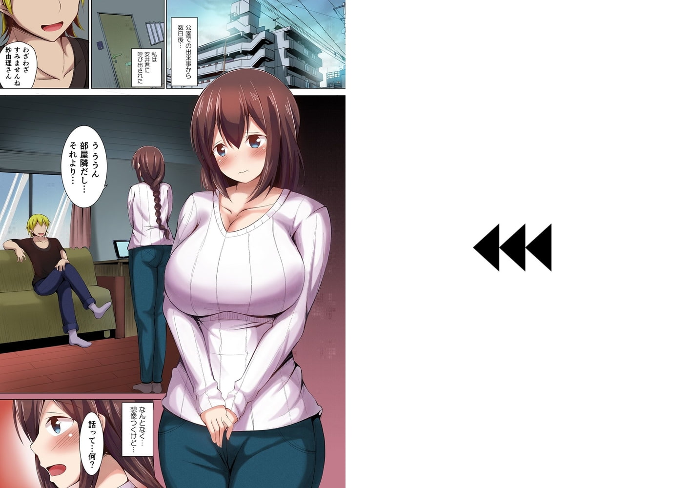 27歳の人妻・新垣紗由理は、バスト95超の豊満ボディの持ち主。夫が単身赴任で寂しい夜が続き、そんな魅力的な肉体を持て余していた。そんなある日、パート先の同僚であり隣人でもあるフリーターの安井に迫られた彼女は、押しに弱い性格に付け込まれ、肉体関係を結んでしまう。オッパイだけ、口でするだけ…と次第にエスカレートしていく安井の要求を断りきれず、最後には絶頂まで導かれてしまった紗由理は、いけないと思いつつも、疼く体を淫らに反応させるようになっていく。安井に淫乱な性質を見抜かれた彼女は、巧みなテクニックに翻弄され逃れられない快楽調教の罠にハメられて行く…!(単話版 第3話)