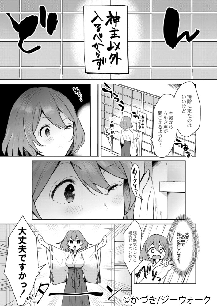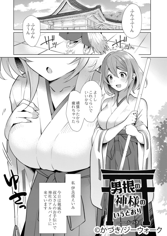 男根の神様を祀る神社でバイトをしていたヒロインのえいみだったのだが、ある日掃除中に本殿からのうめき声を聞き扉を開けたのだがそこにいたのは男根の神様だった!?かづきデビュー作!
