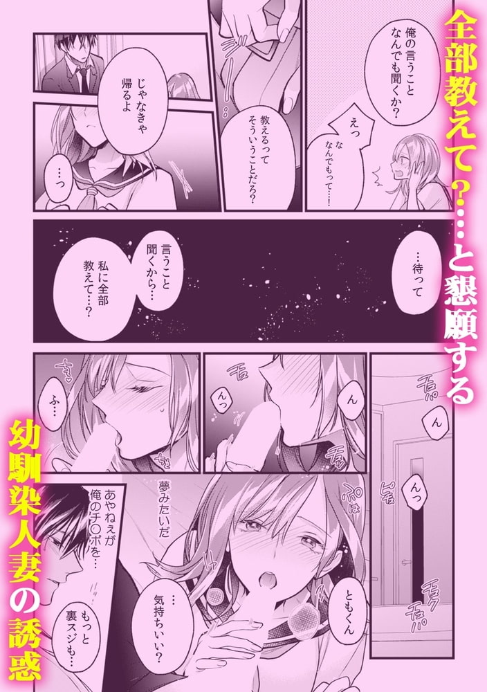 「ちょっと挿入れるだけなら旦那にも怒られないって…だってこれはセックスの練習してるだけでしょ?」――十数年ぶりに再開した幼馴染の「あやね」は夫とのセックスレスに悩み、バイブでフ●ラチオの練習をしていた。それを見かねた俺は「もっと色気出せよ」と忠告すると「じゃあ、ともくんが全部教えて…」と無防備に身体を委ねてきて…。「バイブじゃなく本物を咥えてみるか…?」と聞く俺のモノを健気に頬張り、口内で射精を受け止める幼馴染。「ごめんね…全部飲まなきゃいけないのに…ちょっと口から出ちゃった」こんなにエロい人妻を抱かないなんて…。我慢できなくなった俺はあやねの入口にまだ膨張したままのチ●ポをくちゅりと突き立て、ぐっちょりと濡れた狭い膣穴に挿入する。久しぶりの快感に身悶えしビクビクっと反応するあやね「ダメっ…そんなことされたら…ともくんのオチン●チン忘れられなくなっちゃうっ…!」どうせならこのまま…、俺のチ●ポでセックスの虜にしてやる!