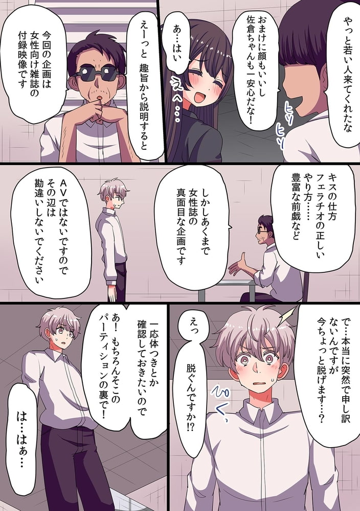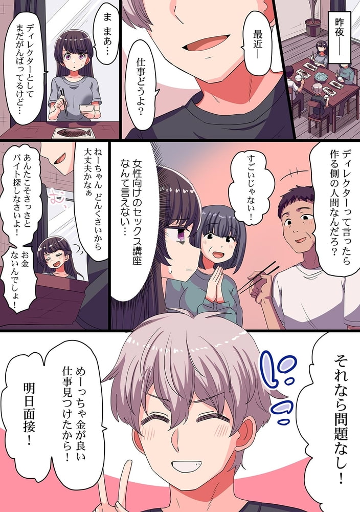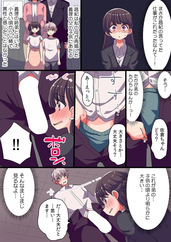 「弟に触られて感じるなんて…私って変態なの?」―仕事で失敗続きの女性AD・佐倉。次は絶対成功させないと後がない…!そんな中担当したのはセックス講座のDVD制作!?まぁ…仕事だからやるけど!しかし男優募集で唯一面接に来た若者は…まさかの義弟!?体つきの確認も必要だと上司に促され、義弟のア〇コの硬さや色を触って確認。「じゃあ、次は愛撫っぽいのしてくれるかー」え?ウソでしょ……?義弟も戸惑いながらも拒否せず私のおっぱいを優しく揉んでいく。ゆっくり触られると逆に敏感になっちゃうよぉ…そのまま乳首もつままれると勃っちゃって、そのままク〇も下着越しに弄られて…私、仕事なのに、ダメなのに…感じちゃってる!