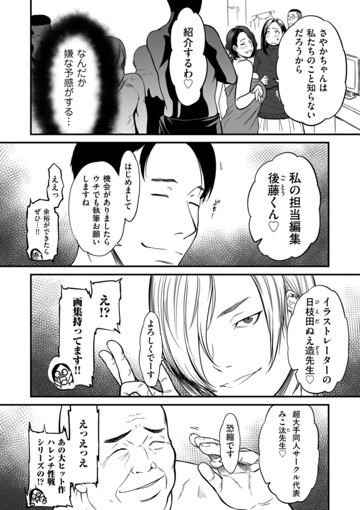 編集の田中さんに誘われるまま漫画家のオフ会へ参加すると、そこにはタオル一枚に身を包んだ有名女性漫画家の早乙女きのこ先生と男性4人がいました。