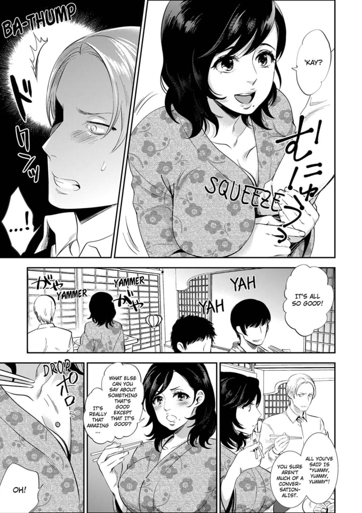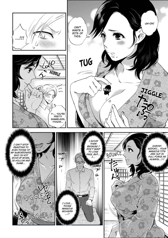 “B-, boss... We can’t do it here...!” Those tits floating in the outdoor hot spring are too hot... I can’t take it! On a company camp, Noko accidentally enters the men’s hot spring area, slips, and gives her boss a face full of her breasts! Such an ample bosom makes the boss loses his senses, and with a little teasing of her perky nipples... Ooooh! That alone’s enough to push Noko over the edge. “Amnh!... My voice... It slipped out...” Even with coworkers around... The steam hides them, and their lustful writhing... Wh-, what should they do...? Doing it there’s wrong, but... The wet, steamy bath... It feels so good, there’s no stopping!!