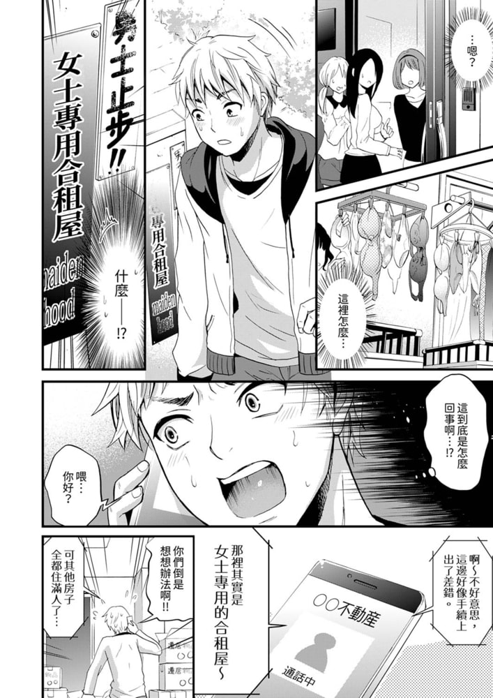 「我才不會…嗚…因為被男生摸…而有感覺呢…嗯啊!」——新學期開始的春天,我離開家人,開始在合租公寓迎來我的全新生活。正當我因新生活而激動不已時,我突然發現了一個令人震驚的事實!那就是……我即將入住的合租公寓,竟然是一家『女生專用』的合租公寓!?而無家可歸的我,唯一的辦法就是『男扮女裝』,偷偷住進這家合租公寓!?好不容易順利住進公寓裡,結果我們學校超討厭男生的學生會長竟然也住在這裡……我一定要想辦法熬過這個問題超多的合租生活,千萬不能被人發現……可是我竟然入住第一天就和會長一起洗了鴛鴦浴!?而且我還順勢為她按摩了起來!當我觸碰她那染上粉紅色的肌膚,她竟然開始露出了陶醉的表情……拜託了,就算被人發現我是男生也無所謂了,快讓我把我的昂揚插進去吧——!!