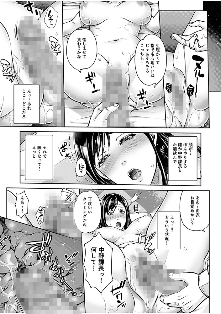「体も心も追い詰められて、どうにかなっちゃいそう」主人の誕生日プレゼントを買いに行った際、ばったり出会った元上司「中野」。妻「由衣」は、再会を祝すものの酔いに負けてホテルへ連れ込まれることに。意識が朦朧とする中で由衣は旦那と間違え心を開き、中野を受け入れる。堅くて太い中野のチ〇コが入ったところで目覚め、主人でイッたことのない快楽が由衣を襲う。主人という背徳がなくなるくらい堕ちた由衣は、このままイケナイ関係を続けてしまう。