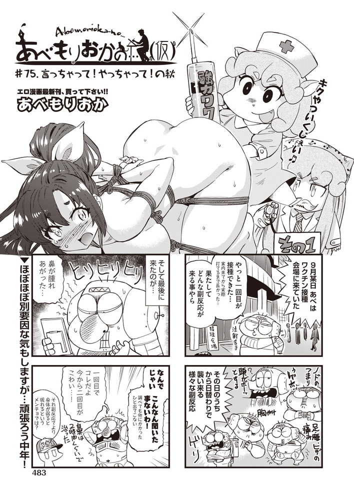 今回のコラムは・・・その1.やっとワクチンの一回目接種を終えたあべせんせい。その日のうちから日替わりで襲い掛かる様々な副反応!その2.バイク仲間の水原賢治せんせいとバイクで林道を攻める!?その3.久しぶりの単行本発売に向け発行部数の打ち合わせ・・・。ヒット出版社に借金している金額は完済できるのか!?