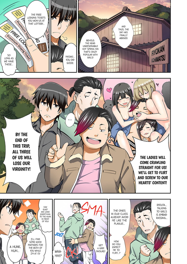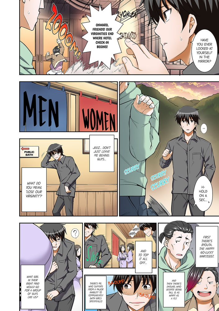 “No… I can’t let it show on my face that I’m… Hnng!!” A group of three boys set off on a completely sex-free hot spring vacation... Or at least, they were supposed to. But in an unexpected twist, they run into three girls from their very own class after checking into the hotel! After panicking and hiding under the covers, one of the boys has his first experience touching a female body in a near-suffocating fashion… when suddenly, it slips inside!? From between the gaps in their robes, the erotic juices won’t stop flowing! And when things escalate to a drunken party game with the girls, just what will happen…!? “I can’t move an inch… or it will go even further inside!!”