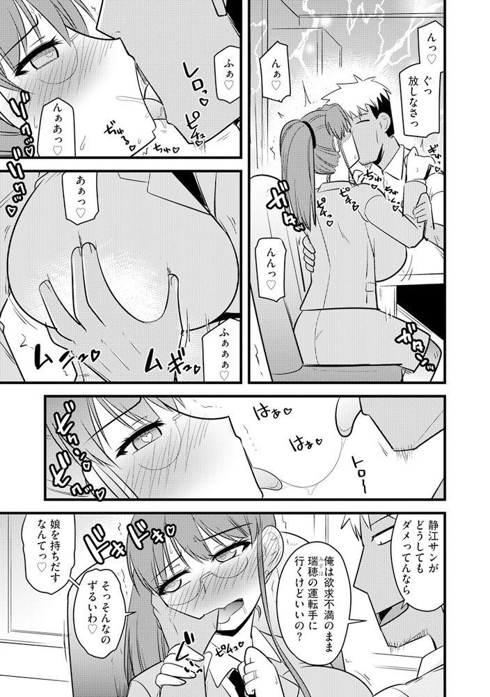 押しに弱い静江を完全に堕とそうとすると、最初は断る素振りを見せたが娘のことを言われると強く出れず狂介に身体を許してしまうのだった。