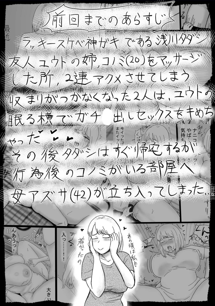 ユウトの姉コノミからタダシがマッサージが上手いと聞いていたアズサは自分にも施すようにと依頼。施術しやすいように寝室に向かうも日ごろの疲れのためかすぐに熟睡してしまう…。悪びれもなくスカートとタイツを脱がせると、ドエロイ下着が!全裸になり起こす前に見抜いてやろうと画策するも…
