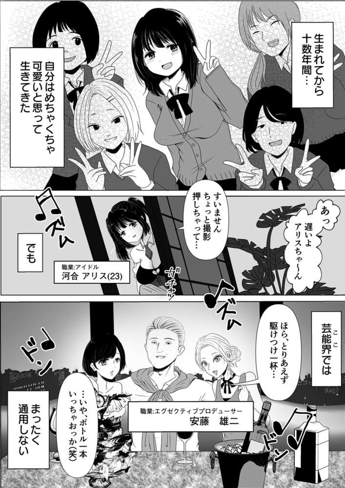 アイドルのアリスは病んでいた。掲示板では誹謗中傷が飛び交い、プロデューサーには半ば強引な性接待による無許可中出しをされ、可愛いと思っていた自分の容姿が全く通用しない。芸能界のテンプレとも呼べる闇に飲まれ、生きる意味すら見失っていた。