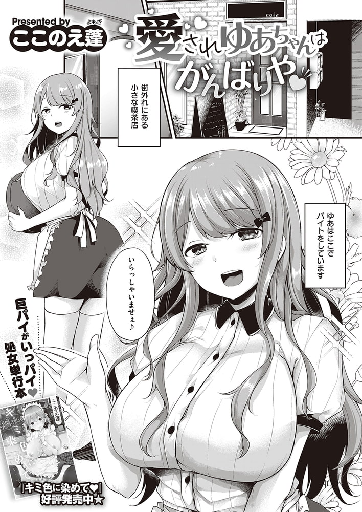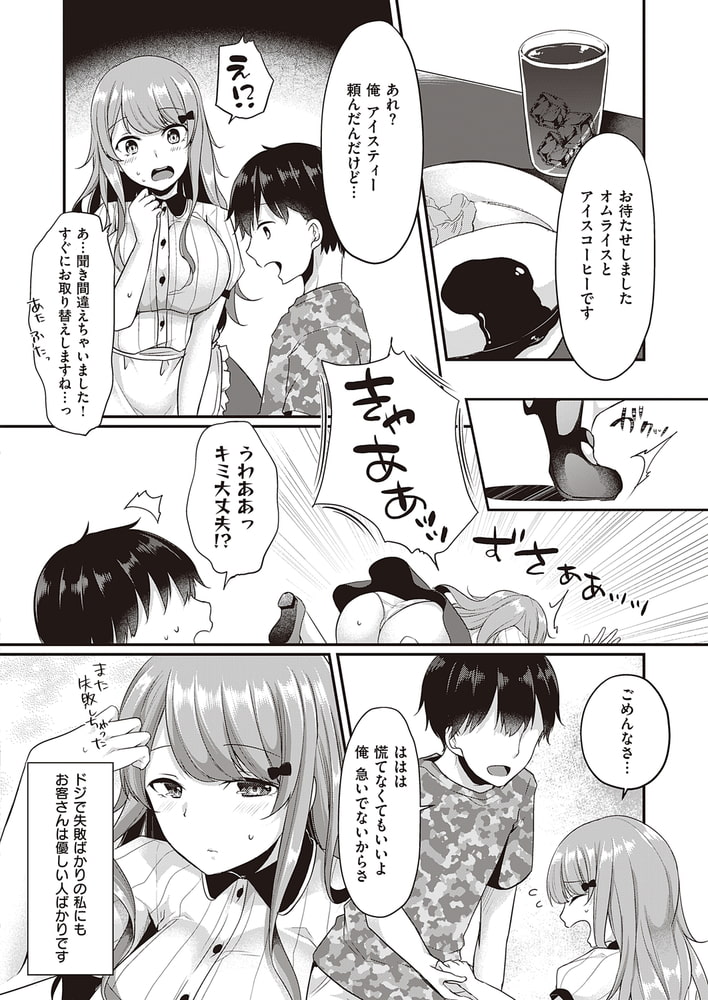 デカパイアンバサダーのここのえ蓬先生描く、ドジっ子巨乳ウェイトレスさんをカラダで癒す優しく甘い3P♪