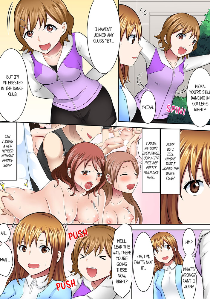 "Aaah! If you rub me there, I'm gonna lose my mind..." A female college student, Serina, is approached by a boy from another school, Touma, during a dance club training camp. Touma gives a lesson to the shy and introvert Serina, but he soon stretches out his fingers toward her leggings and pussy...!? "Ahn!" "Stop teasing my nipples there!" "Eek... your fingers... they're amazing...!" "Ah! Not my insides!" Serina moans and pants to her first pleasure. The other club members are also involved in the endless lewd training camp...!