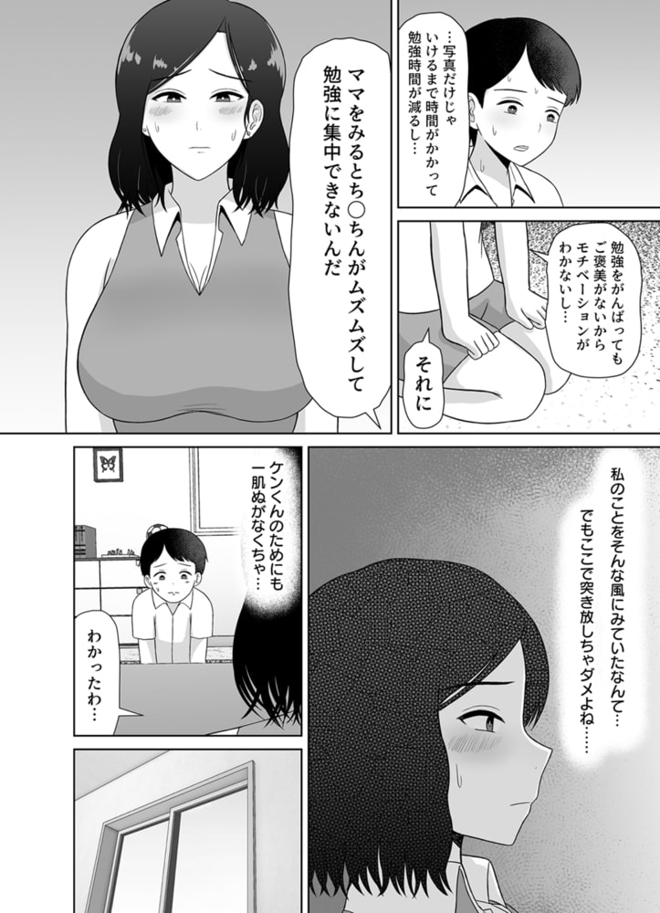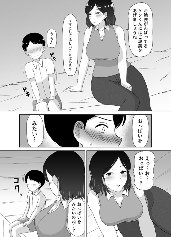 「ママをみるとち〇ち〇がムズムズして勉強に集中できないんだ」と悩みを打ちあけられた母は息子に寄り添うため、勉強のモチベーション低下を防ぐため、ご褒美という名目で息子の自慰行為を手伝うことにする。