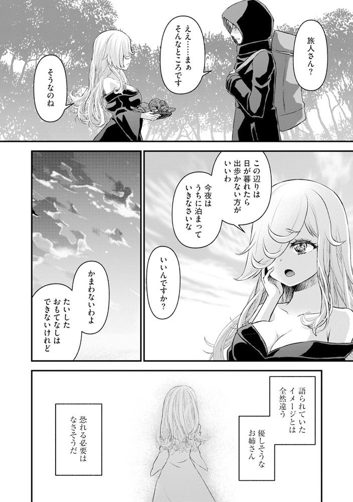 彼を屋敷に招き入れた魔女は、青年に食事を食べさせ屋敷に泊めることにした。