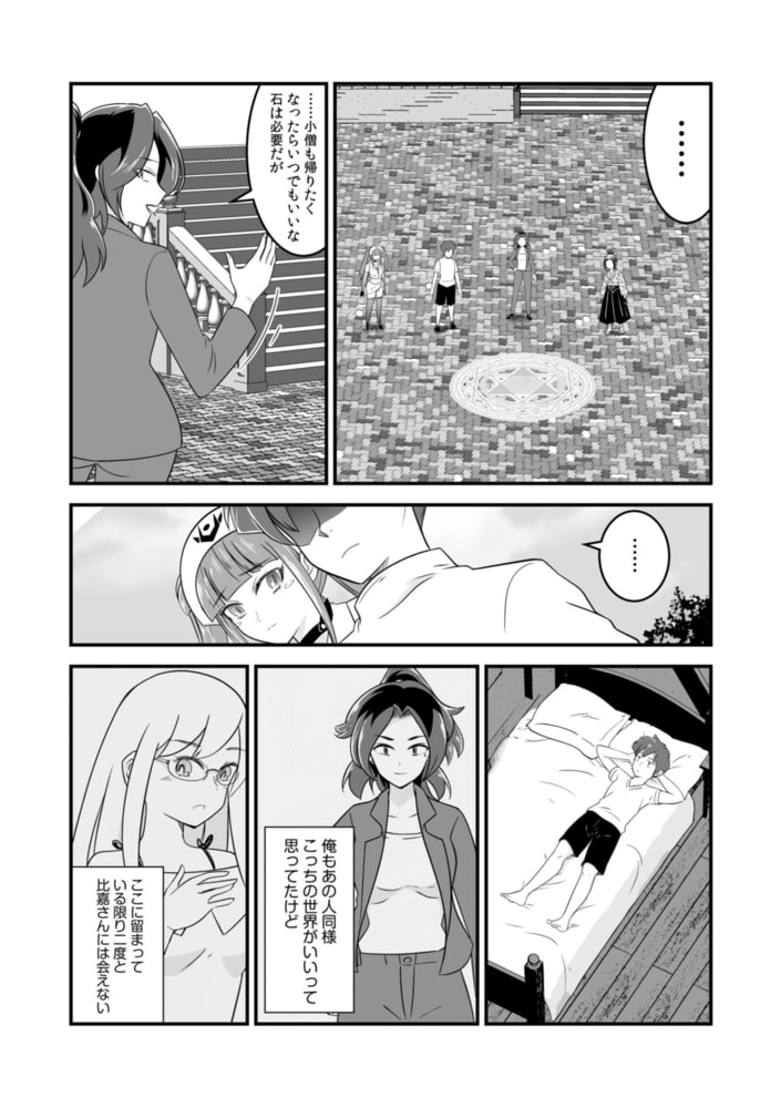 「召喚石があればなんでも出来るぞ」と言う彼女にキョータは、ゲームの世界に召喚された比嘉さんを元の世界に戻してくれるように頼む。