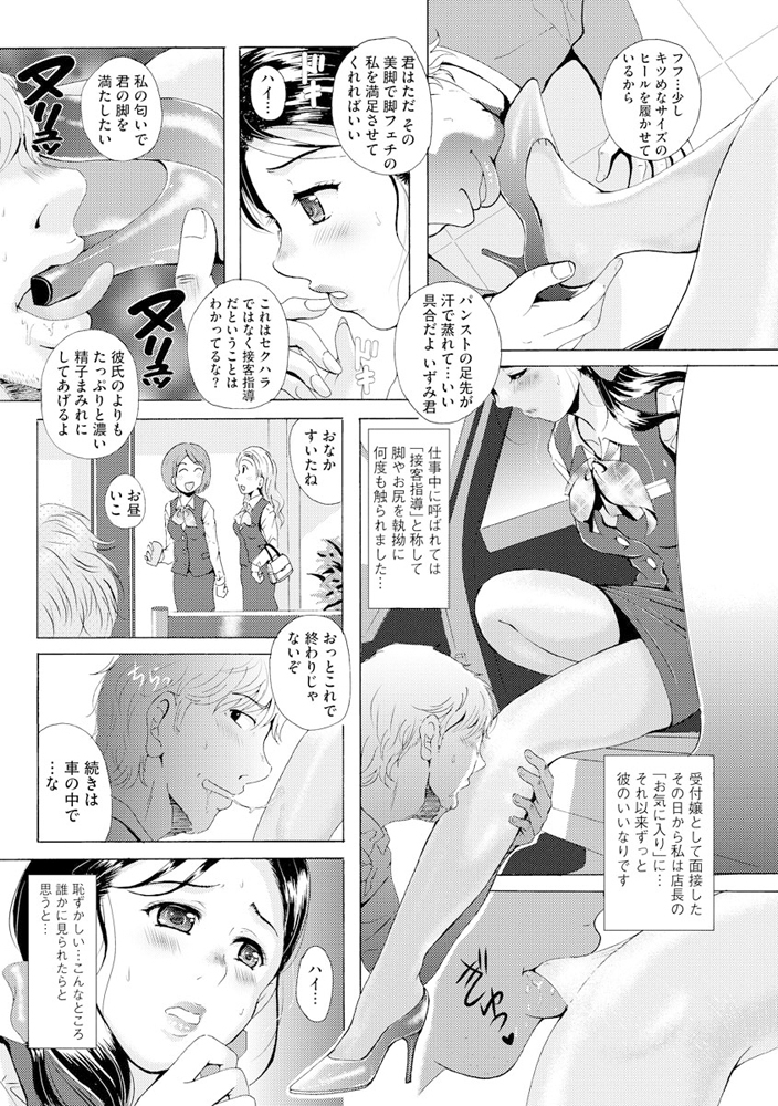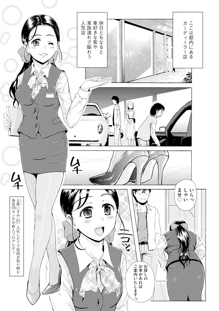 その彼女のスラリと伸びた美脚を後ろから嘗め回すように視姦する店長はいずみをこっそりと呼び出し、展示車の座席でパンストの脚にキスをしたり撫でまわす。