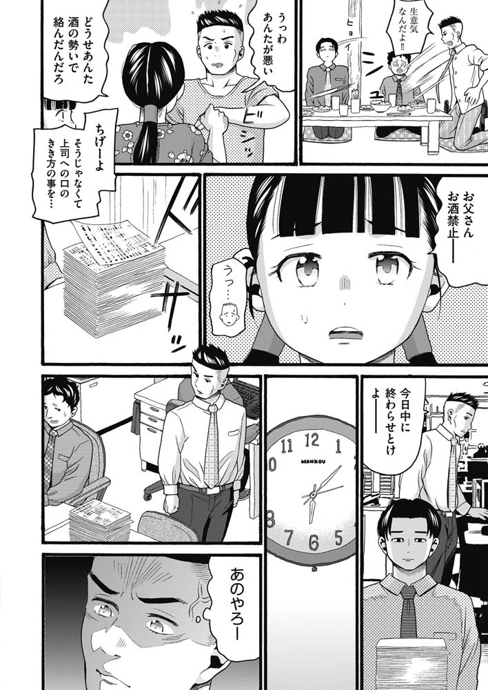 会社の部下に酒の席でお酒を勧めたが断ってきた新人部下の伊達に腹を立てる友永さん。仕事を多くふったり、ロッカーにいたずらしたりと仕事で嫌がらせやパワハラを繰り返すも、ある日の呑み会で反撃されてしまい腕の骨を折られてしまう。退院して会社に復帰するころ、娘のアキナが何者かに誘拐されて行方不明になってしまう。伊達の仕業と騒ぐが証拠がないが、その推測は当たっていて伊達の家の地下に全裸で鎖で逃げられないようにされ監禁されていた。もちろん性的な凌○も伊達から受けていた・・・。