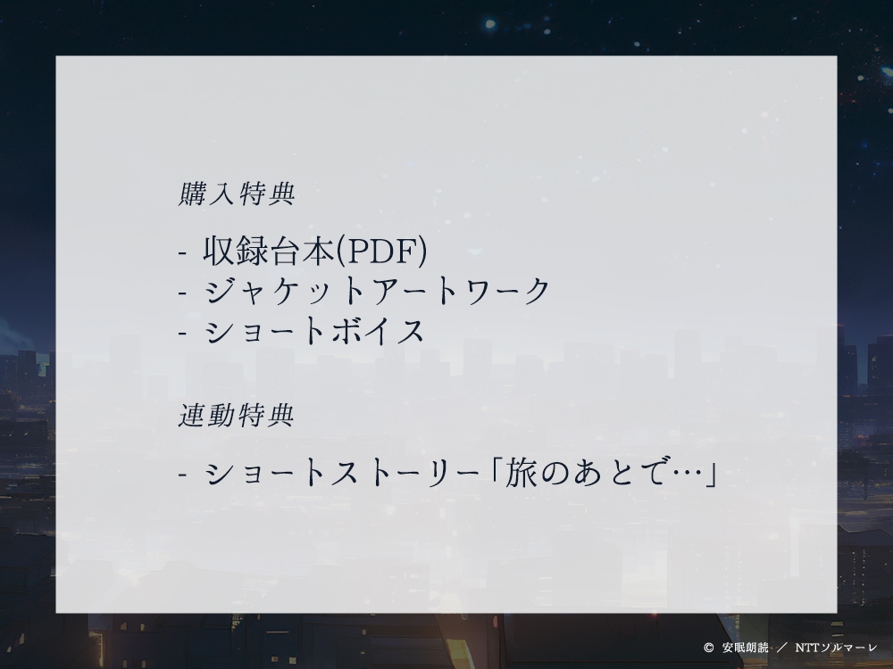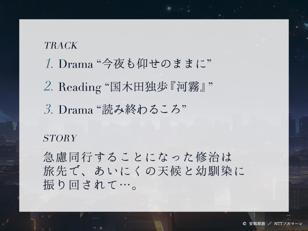 ![安眠朗読 今夜も眠らNight 幼馴染・修治が読む「国木田独歩『河霧』」 [安眠朗読] 安眠朗読 今夜も眠らNight 幼馴染・修治が読む「国木田独歩『河霧』」 [安眠朗読]](http://img.dlsite.jp/modpub/images2/parts/BJ02407000/BJ02406994/BJ02406994_35c3f6670f39b472f73af1298236b3a4.jpg)