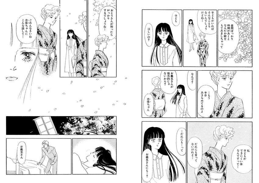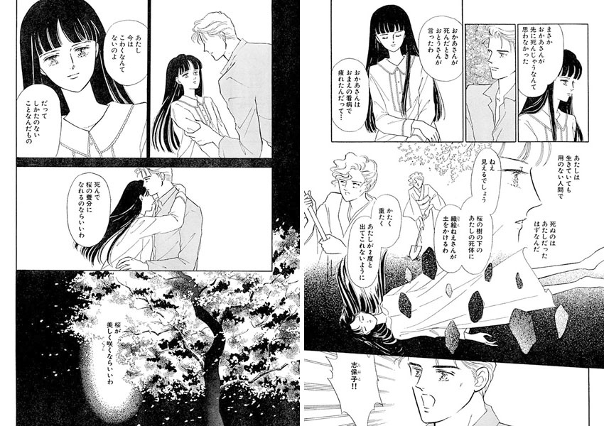 桜の花の影に見え隠れする母屋の窓に、ときおりこちらを見つめる織絵の妹、志保子の顔がのぞく。