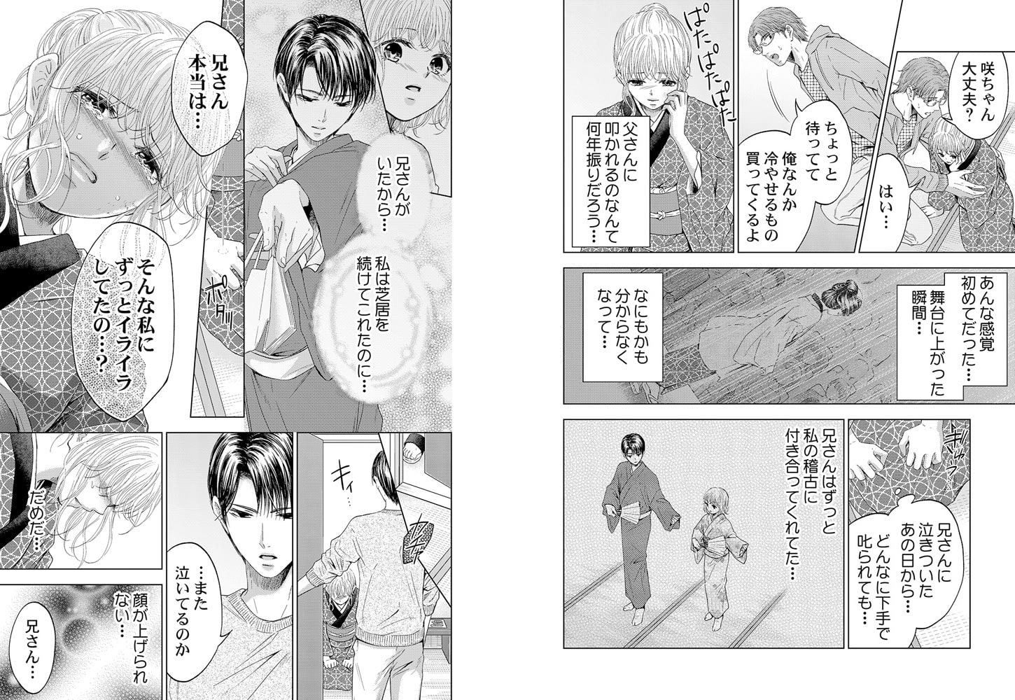 「じゃあこれも夢か?お前のここが…こんなにグショグショになってるのも…」私…この感触を知ってる…――劇団『春川座』の女形で看板役者の辰次とその妹で未熟な女優の咲。ある日の稽古中に辰次から「もう役者辞めれば?」と言われて落ち込む咲。そんな状況を見かねた劇団員の涼太郎は咲を食事に誘う。兄からのプレッシャーから逃げるべく酒を飲んだ咲はいつしか酔いつぶれてしまった。そこに現れたのは辰次。酔いつぶれた咲を見つけると涼太郎が目を離している間に宿泊先に連れ戻した。咲をベットに寝かせると「涼太郎さん…」という寝言が。その刹那にたがが外れて咲にキスをした――。涼太郎からの告白、そして兄からのゆがんだ情愛、咲の身体が求めるものは…!?