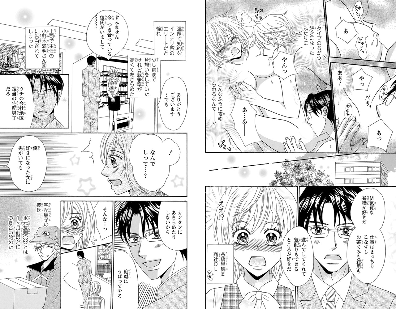 ガテン彼氏とインテリ上司に挟まれて、オフィスで逃げられない3人エッチ!? 胸も大事なところも同時に攻められて…私はどっちを選べばいいの!? 「M気質な谷橋が好きだ」そんな告白をしてきたのは、かつて私が思いを寄せていたモテる上司・満明さん。けれど、私には大好きなガテン彼氏の友則がいるから断ったんだけど…満明さんは「うばってやる」と宣言してきて!? 友則に相談して、極力満明さんを避けていたけど…。残業の夜、オフィスで二人きりになった時、満明さんに縛られてしまい…助けにきてくれ友則と、奪い合いのオフィスエッチで二人に絶倫に攻められちゃう!