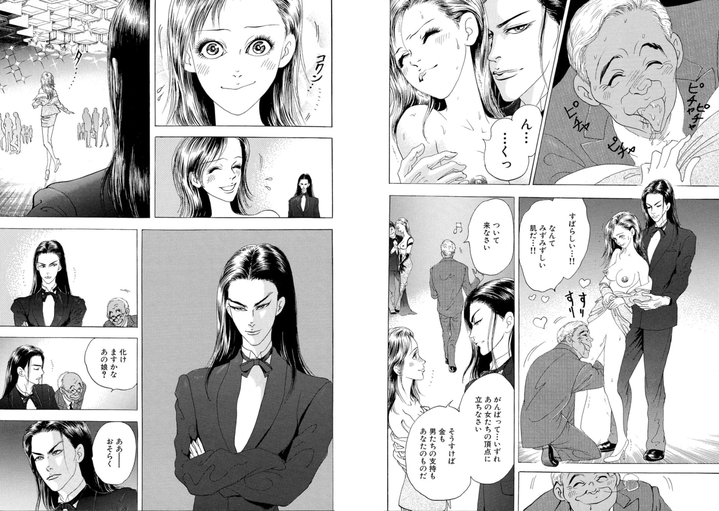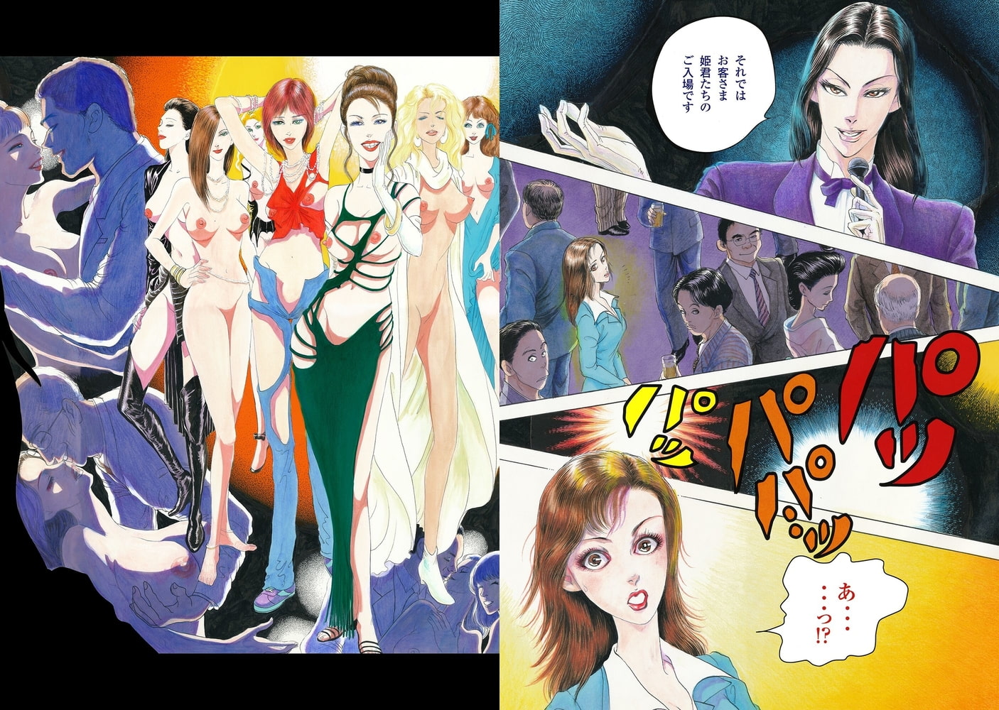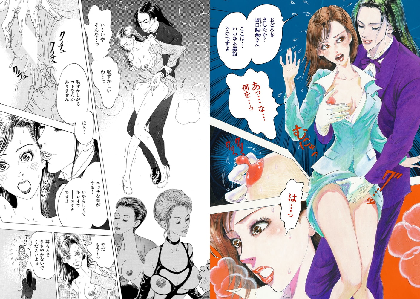 「それでは皆様、姫君達のご入場です」入ってきたのは、ほとんど全裸の美女の集団だった!! 驚く私は、いきなり胸をはだけられ乳房を揉まれ、乳首を摘まれ、スカートを捲られて下着の横から指を入れられてアソコを弄られる。「驚きましたか? 坂口梨奈さん。ここはいわゆる娼館なんですよ」「いや、そんな…っ恥ずかしいわ…っ」「恥ずかしがる事なんかありません。ほら…Hな音がする…いやらしくて綺麗で素敵ですよ」耳元で囁かれると、ますます感じちゃう。でも気持ちいい。「君、その女性もいいのかね?」「勿論です。まだ見習いですが、それでも宜しければ」「構わんとも」男は私の股間をピチャピチャと舐めて!?