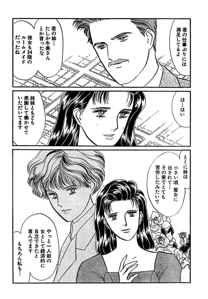 久住燈子、パレスサイドホテルオーナー久住政之助の妻。息子も生まれ女として幸せになりかけている道中であった。しかし燈子にはこの幸せを曇らせる不安が二つあった……。一つは、ライバル会社を蹴落とすため、業務提携にやけになっていること、もう一つは心を開いてくれない妹の冬美が急に結婚すると言い出したこと……。
