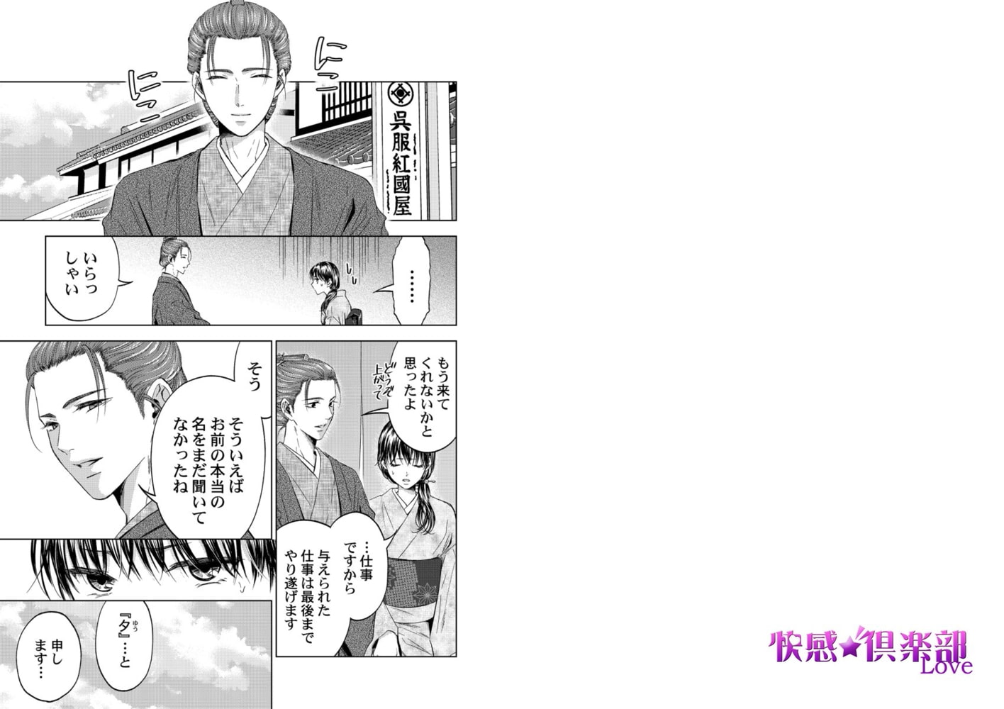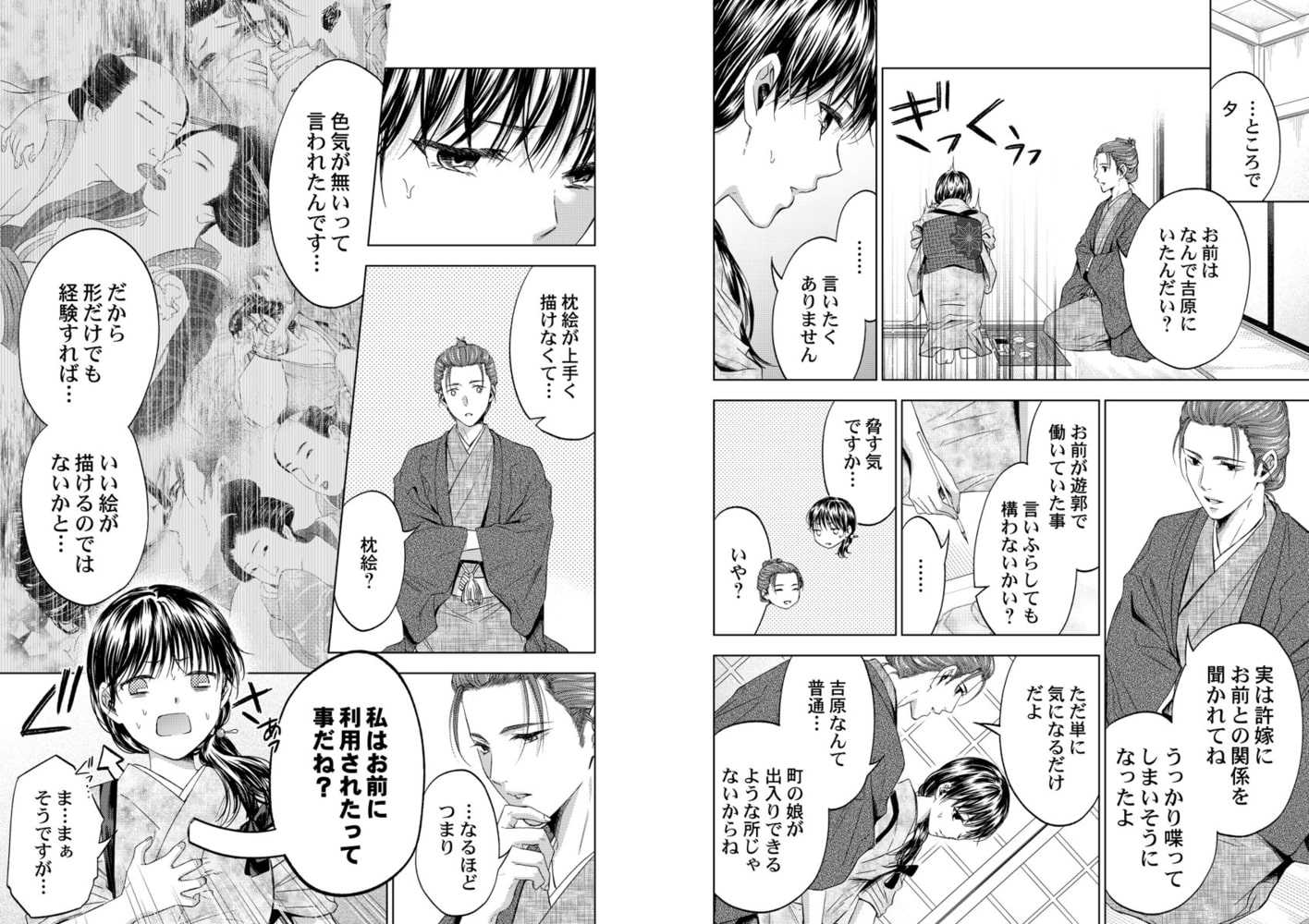 「私に任せて…悦くしてあげるから、お前がこの夜を忘れられないくらいにね」とある理由から吉原で働くことになった朝日は、呉服屋の若旦那の菊次郎の目に留まり指名されることに。緊張していた朝日だが、濃厚なキスで感じさせられ、乳首やアソコを丁寧に指と舌で愛撫され…初めてなのにイっちゃう…!後日、朝日のことが忘れられない菊次郎は再び訪れるも、すでに辞めたと聞かされる。朝日が吉原にいた理由、そしてその正体とは――!?