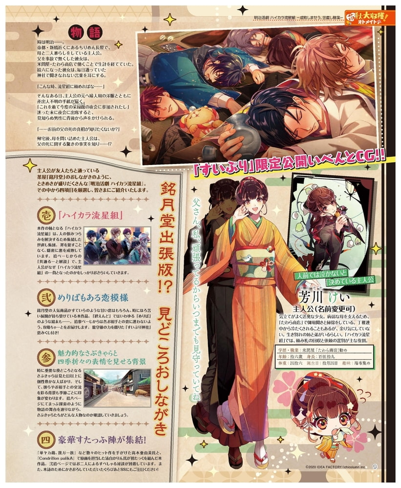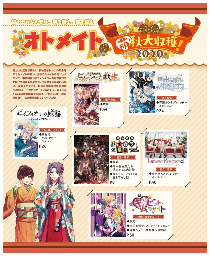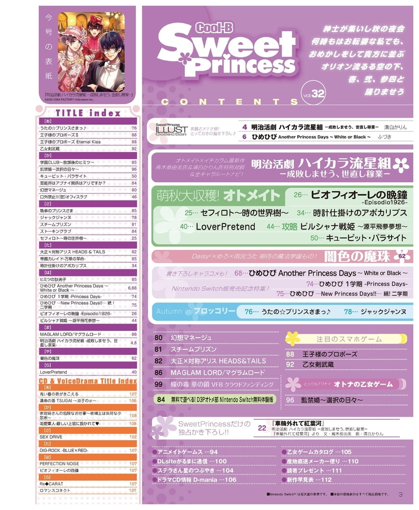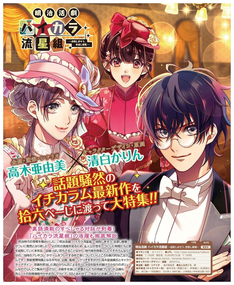 今号の表紙&巻頭特集はイチカラム最新作『明治活劇 ハイカラ流星組』。制作陣の特別対談や攻略情報と見どころ満載!めろ氏と雨宮うた氏の最強タッグで贈る『闇色の魔珠』最新情報もお届け。最新作が発売間近な『ひめひび』シリーズの特集も必見。