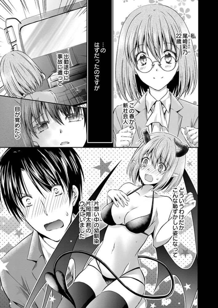 彩乃はこの春から新社会人。同い年の幼馴染・翔太のことが好きだったが、勇気が出せず告白できずにいた。そんなある日、通勤中に交通事故に遭ってしまう。片想いのまま終わっちゃうんだ…と死を覚悟した彩乃。だけど目覚めるといないはずの翔太が目の前にいて、体に羽根と尻尾が生えていた!(しかも角つき!) な、なんなの~! この恥ずかしすぎる格好は…!! わけがわからず混乱している彩乃に、翔太が羽根をくいっと引っ張ると、むわっとむせるような甘い香りが立ちのぼり、まるで性感帯を触られているような衝撃が彩乃を襲って――!?