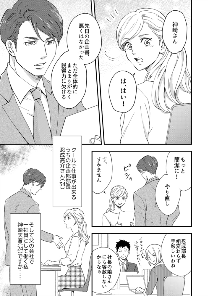 父の会社で働く天音(24)と、天音の上司で部長の亮介(34)。一見、普通の上司と部下に見える2人だが…実は周囲に内緒で結婚している新婚夫婦。会社ではクールで厳しく、入籍するまで一切手を出してこなかった亮介だが、今では家に帰るとすぐ天音を求めてくる。甘い言葉で囁きながら優しい手つきで胸やアソコを愛撫してきて…。奥深くまで攻められ、何度もトロトロにイカされ続ける日々。そんなある日、亮介は天音に触れなくなってしまう。態度は優しいままなのに、急にどうして…。さらに亮介と親密な女性も現れて!?ますます不安になる心…この関係、どうなるの!?