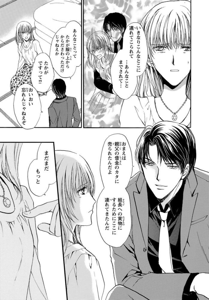 製薬会社営む裕福な家、卒業後の就職先も決まっている…大学四年生の大貫可菜は、平穏な日々を過ごしていた。しかし、父が騙されてつくった借金のカタに、可菜は極道・柊洋司に引き取られる。若頭候補である洋司は、可菜を組長への貢ぎ物として、「女」に育てるつもりで…。両親に見放され、極道に引き取られ…そして、容赦のない洋司。そんな境遇の中、可菜はある決意をする――!