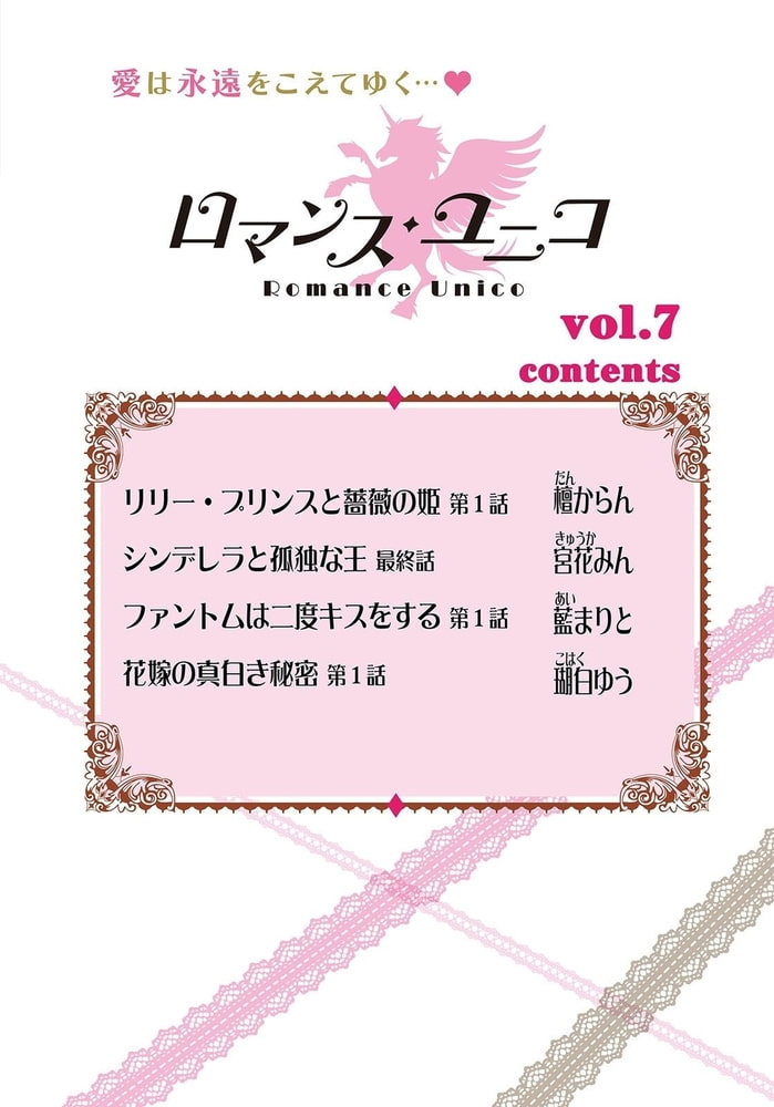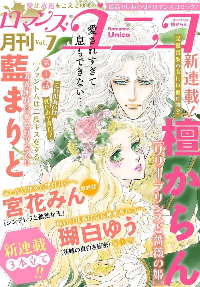 毎月更新!! web雑誌ロマンス・ユニコ第7弾は、新連載3本立て!★更新作品は4作品★奇跡の愛の新連載「ファントムは二度キスをする」藍まりと★怒涛のハッピーエンド最終回「シンデレラと孤独な王」宮花みん★記憶喪失ヒストリカル新連載「リリー・プリンスと薔薇の姫」檀からん★伯父の花嫁に狂おしく恋する新連載「花嫁の真白き秘密」瑚白ゆう★愛は永遠をこえてゆく…あなたもこの愛を見届けて!