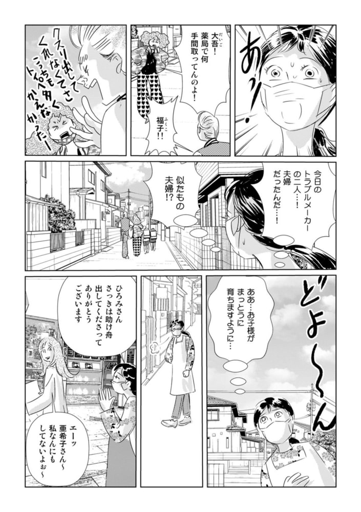 街のごく普通なドラッグストアに勤める亜希子は、ちょっと冴えないパート店員。今日も特売のトイレットペーパーを求める長蛇のお客様相手に大忙し。だけど亜希子には誰も知らない秘密の顔があるのです…それは……! 店内で怒鳴り散らす元ヤンキーおじさん、試供品を大量に持ち帰ろうとする虐○ママ、老人・子供を突き飛ばして店員につきまとうストーカー女…などなどの他人に迷惑をかけまくる非常識な奴らをハイテク技巧と美麗な変装術で罠にハメ、罰を与える! 謎多き美女・亜希子が自分の信じる正義のもとに私刑を下す、スッキリ爽快ダークヒロインストーリー!!