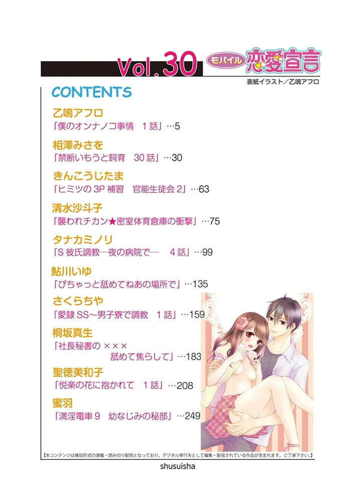 誰にもいえないヒミツの事情…禁断関係 連載、読み切りの人気作品がもりだくさん♪ 僕が女の子になっちゃった!? こんなの誰にも話せないよ…! 乙鳴アフロ「僕のオンナノコ事情」 私がおにーちゃんと実の兄妹…? 私とおにーちゃんは恋人同士なのに…。 相澤みさを「禁断いもうと飼育」 パーティー会場でこっそり社長と!? 桐坂真生「社長秘書の××× 舐めて焦らして」 心もカラダも切なくなる乙女のLOVE&Hコミック!モバイル恋愛宣言で大人気作品が登場!!(C)乙鳴アフロ/相澤みさを/きんこうじたま/清水沙斗子/タナカミノリ/鮎川いゆ/さくらちや/桐坂真生/聖徳美和子/蜜羽