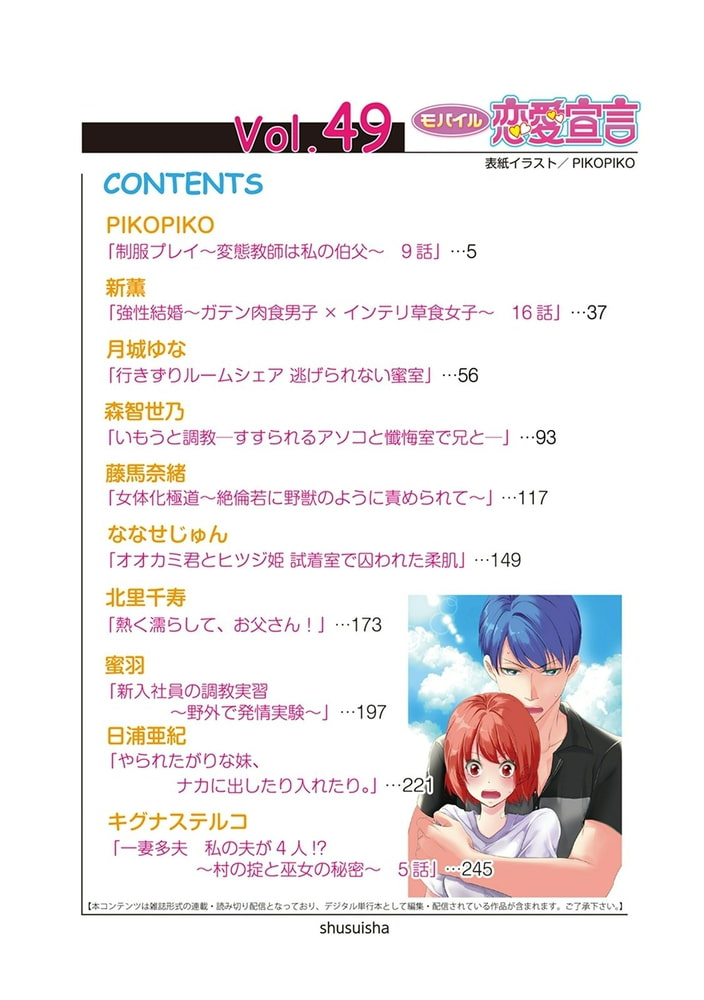 ひとつ屋根の下で二人きり 密室同棲H 連載、読み切りの人気作品がもりだくさん♪ 嫌いだったはずなのに…仮の夫への好意がとまらない!? 新薫「強性結婚~ガテン肉食男子×インテリ草食女子~」 ルームシェアメイトとHな同棲開始!? 月城ゆな「行きずりルームシェア 逃げられない蜜室」 ランジェリーショップの店員が、お客様に試着室で迫られて…!? ななせじゅん「オオカミ君とヒツジ姫 試着室で囚われた柔肌」 心もカラダも切なくなる 乙女のLOVE&Hコミック!モバイル恋愛宣言で大人気作品が登場!!(C)PIKOPIKO/新薫/月城ゆな/森智世乃/藤馬奈緒/ななせじゅん/北里千寿/蜜羽/日浦亜紀/キグナステルコ